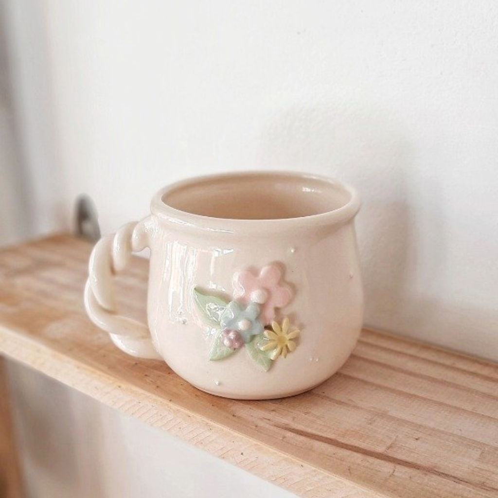 Taza grande de cerámica color arena, con flores colores pastel. La medida aproximada es 8 cm x 8 cm. y una capacidad de 300 cc.