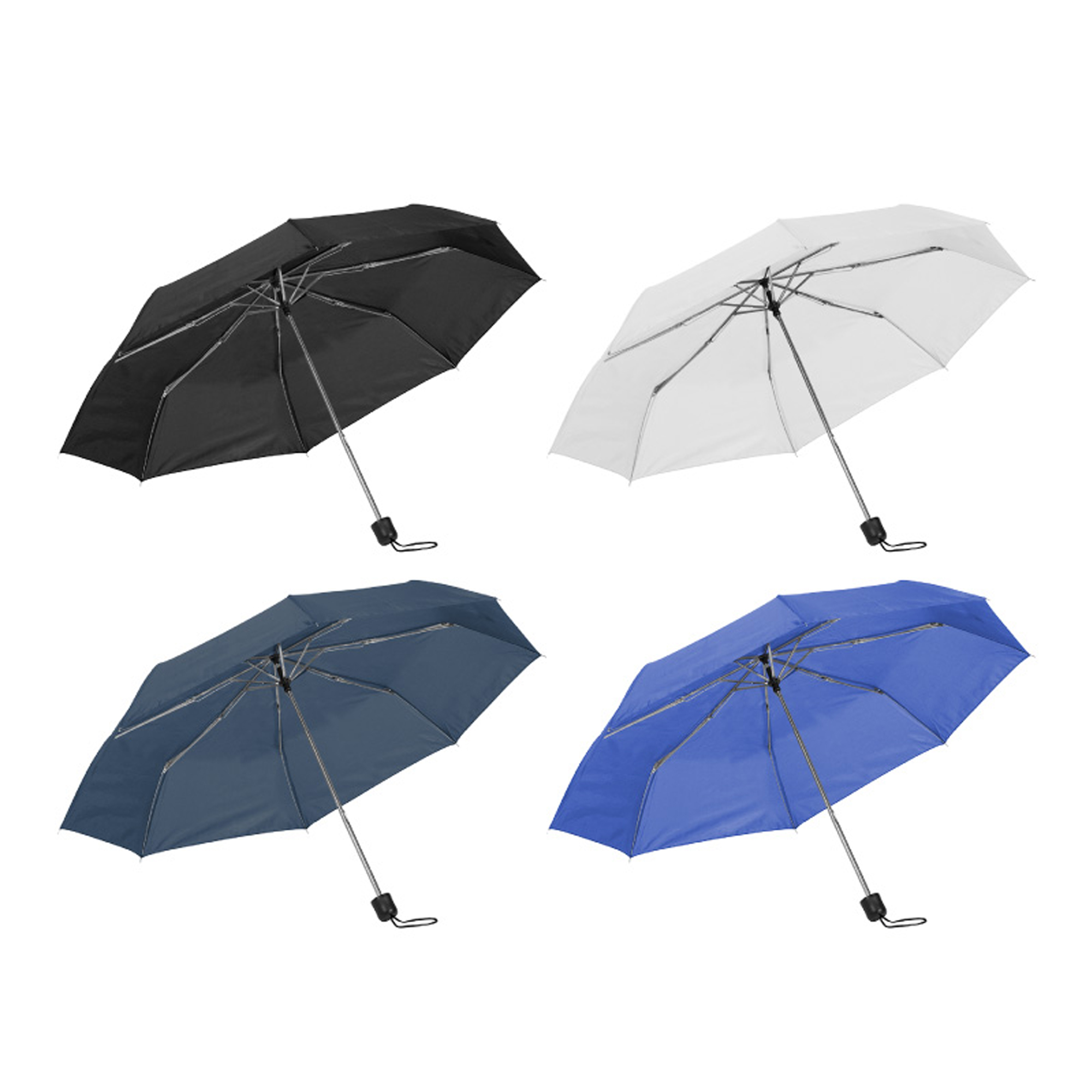 Ø 98 cm. 8 gajos. Ancho gajo 37 cm. Largo cerrado 24 cm. Largo abierto 54 cm. Poliéster, metal y plástico. Paraguas APERTURA Y CIERRE MANUAL. Eje y varillas metálicas. Mango de plástico negro con correa cordón color negro. Cierre con correa de velcro.